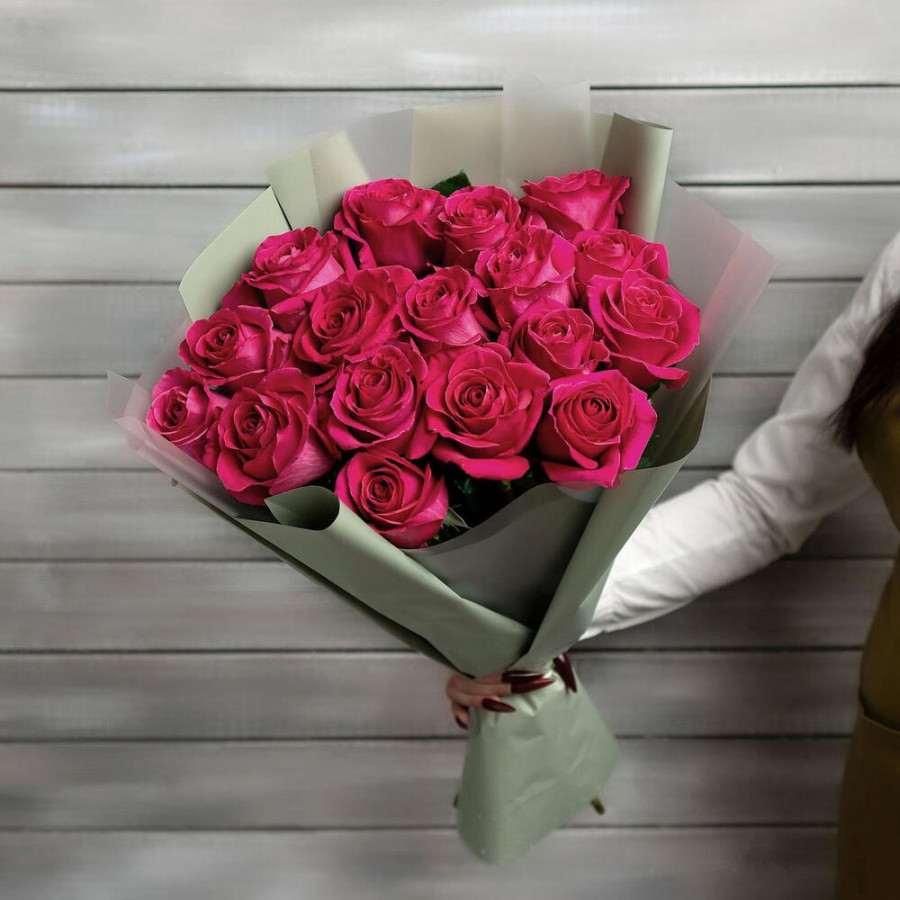 На фото 17 малиновых роз. В составе: роза 17 шт, дизайнерская упаковка 1 шт, атласная лента 2 шт, . Все цветы свежие и ароматные, букет красиво оформлен и отлично подходит для подарка. Доступна доставка цветов или самовывоз.